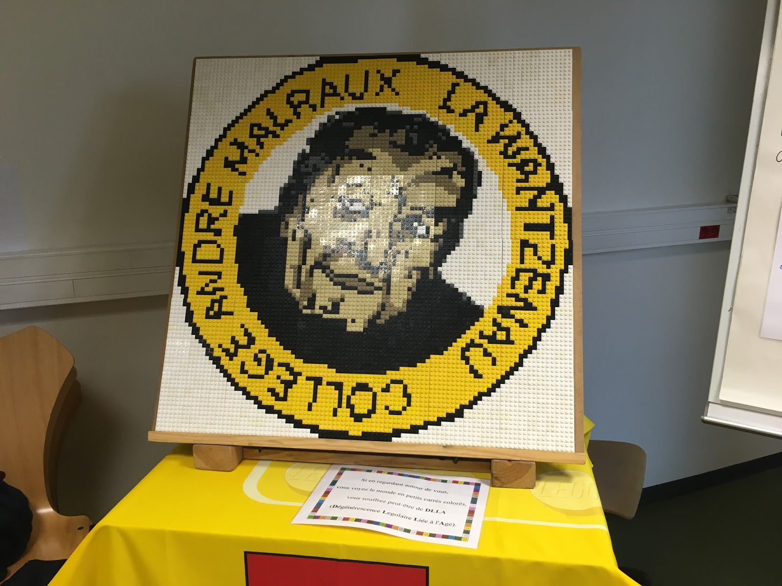 Enseignants, élèves, visiteurs du moment ont contemplé ces réalisations. Le livre d'or ouvert à cet effet en témoigne. Ils ont aussi pu apprécier la réalisation du dispositif ULIS : une mosaïque représentant André Malraux. 3913 briques, une journée d'assemblage....C'est une prouesse qui n'a pu voir le jour sans l'aide experte de parents (Mr et Mme Zimmer, Mme Doerr) férus de LEGO qui ont prêté main forte à leurs enfants.